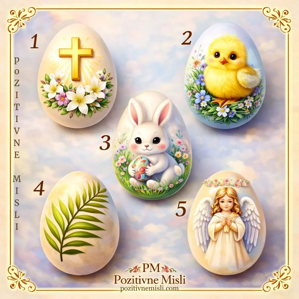 Pred tabo je pet velikonočnih jajc. Vsako nosi svojo energijo, svojo zgodbo in svoje sporočilo. Ne išči najlepšega, ne išči logike. Poglej sliko… in dovoli, da te eno jajce pritegne. To, kar si izbrala, ni naključje. To je odsev tvoje notranje energije in obdobja, v katerem si.